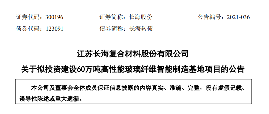 长海股份发布公告,拟投资63.47亿元投建60万吨高性能玻璃纤维智能制造基地项目。