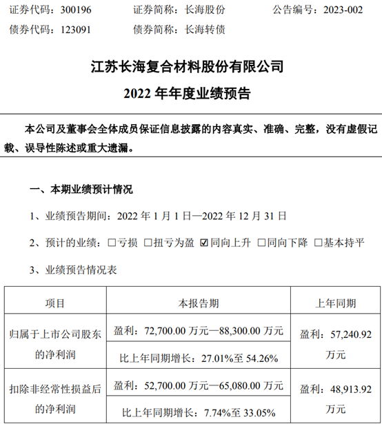 挖贝网1月31日,长海股份(300196)近日发布2022年年度业绩预告,预计2022年归属于上市公司股东的净利润72,700.00万元—88,300.00万元,上年同期57,240.92万元,同比增加27.01%至54.26%。