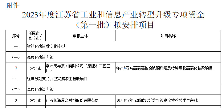 2023年3月20日,江苏省工业和信息化厅发布2023年度江苏省工业和信息产业转型升级专项资金(第一批)拟安排项目名单,中硅会玻纤分会/全国玻纤情报网高级会员单位江苏长海复合材料股份有限公司、会员单位常州天马集团有限公司(原建材二五三厂)项目入选。