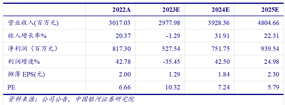 作为国内领先的玻纤制品及玻纤复合材料生产企业,公司在产业链、技术、品牌、研发创新等方面均具有明显优势。随着公司全产业链布局不断完善,产能不断扩张,以及环保政策带来的下游复苏,公司业绩有望提升。预计公司23-25年归母净利润为5.28/7.52/9.40亿元,每股收益为1.29/1.84/2.30元,对应市盈率10.32/7.24/5.79倍。基于公司良好的发展预期,维持“推荐”评级。