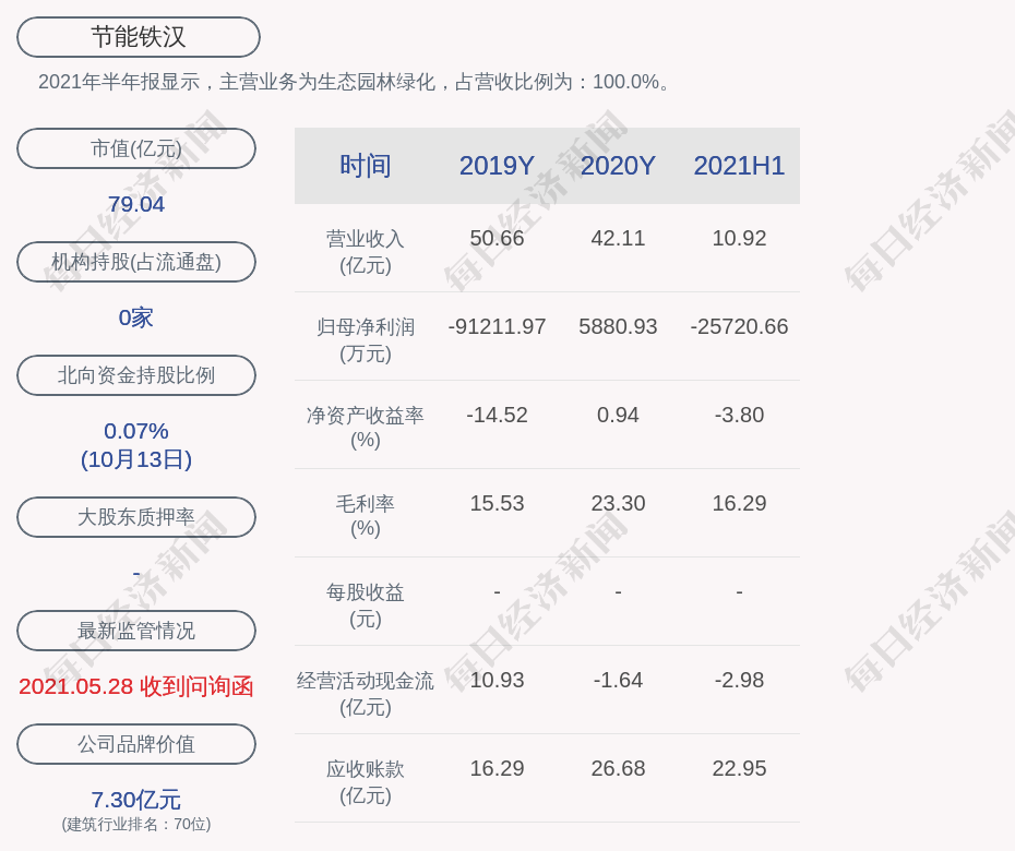 2021年半年报显示,节能铁汉的主营业务为生态园林绿化,占营收比例为:100.0%。