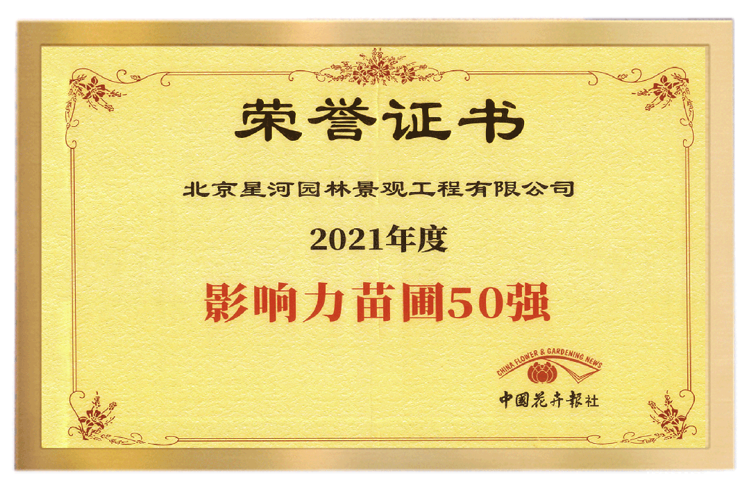 近日,2021年度影响力苗圃(苗圃50强)名单揭晓,中节能铁汉星河(前身为北京星河园林景观工程有限公司)获得“2021年度影响力苗圃50强”和“2021年度影响力十佳苗圃”两项殊荣。