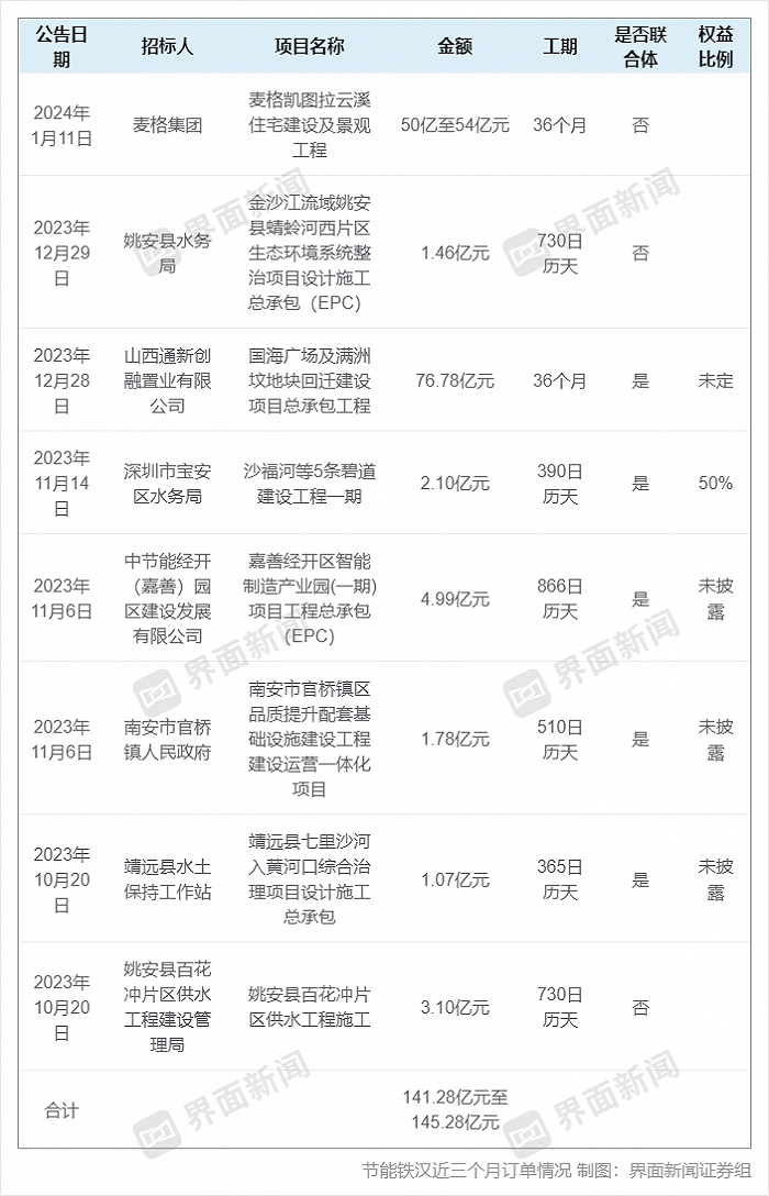 不过近期,节能铁汉接单速度明显加快。据界面新闻统计,公司近三个月披露的订单金额合计超过140亿元(包括联合体订单)。