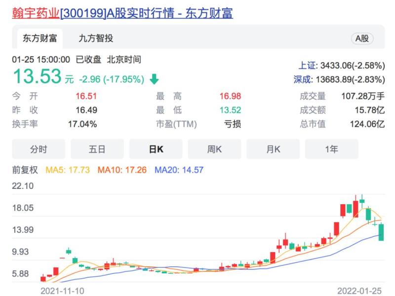 1月25日收盘,翰宇药业报收13.53元,大跌17.95%,最新市值为124亿元。