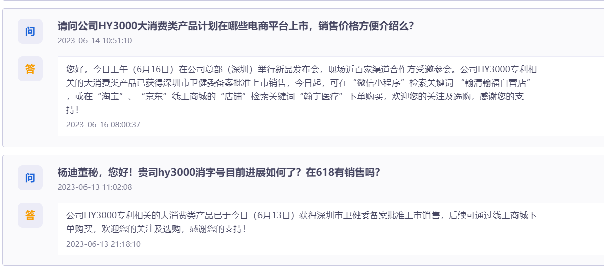 然而,随着疫情管控政策的变化,HY3000鼻喷雾剂一直未能上市。直到今年6月13日,翰宇药业才在投资者平台上宣布,与HY3000专利相关的大消费类产品已获得深圳市卫健委备案批准上市销售。
