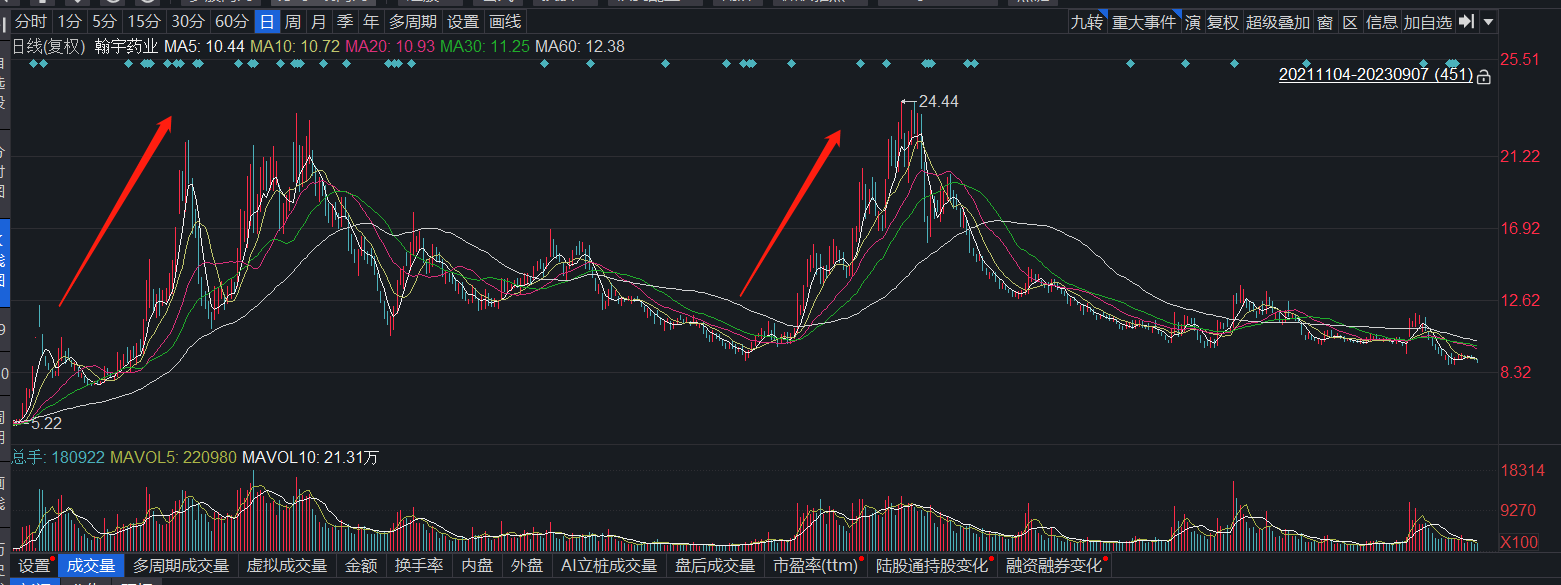 在翰宇药业对新冠产品热衷的背后,是其股价大幅的波动。从2021年11月开始,翰宇药业股价开始飞速地增长股价从5元附近,上行到20元附近。在经过调整后,依托新冠产品的热点,翰宇药业股价再从8元附近一路行至最高24.44元。
