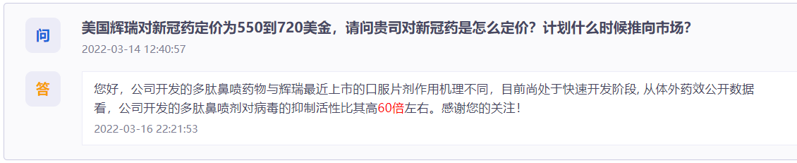同时,2022年3月14日,翰宇药业在互动易平台回复投资者问询时表示,“公司开发的多肽鼻喷药物与辉瑞最近上市的口服片剂作用机理不同,目前尚处于快速开发阶段,从体外药效公开数据看,公司开发的多肽鼻喷剂对病毒的抑制活性比其高60倍左右。”