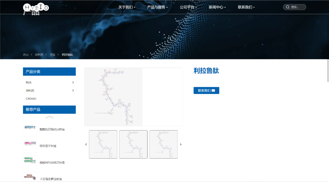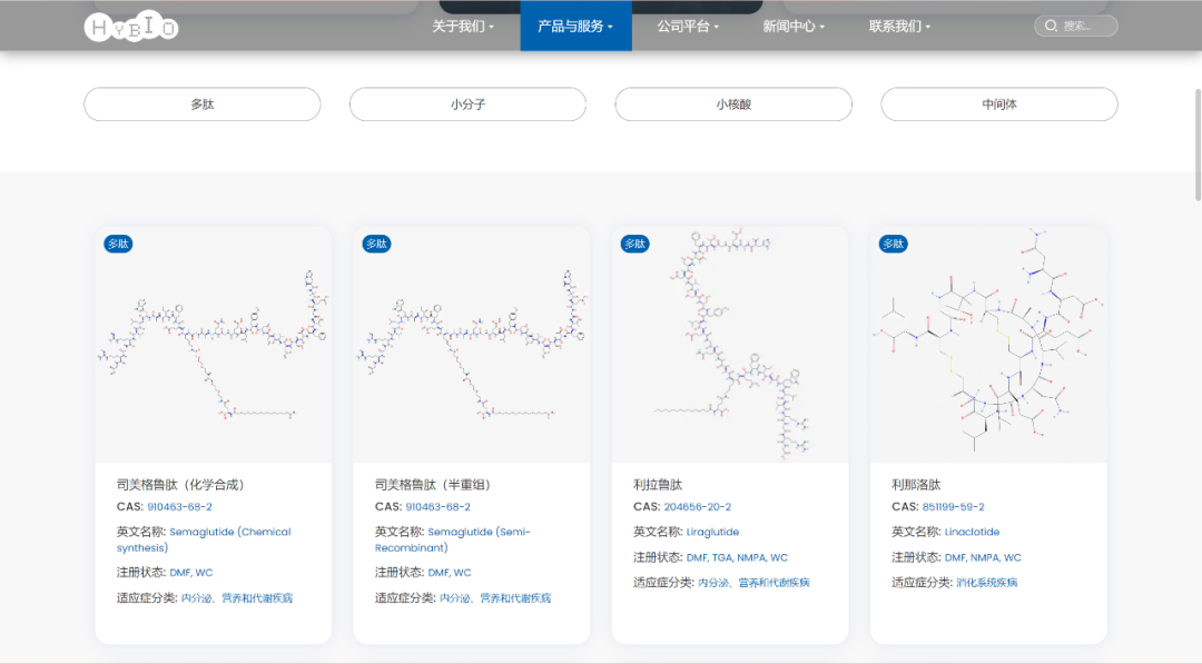 Take API products as an example: click the buttons for Peptides, Small Molecules, Small Nucleic Acids, and Intermediates to view the company’s different categories of APIs