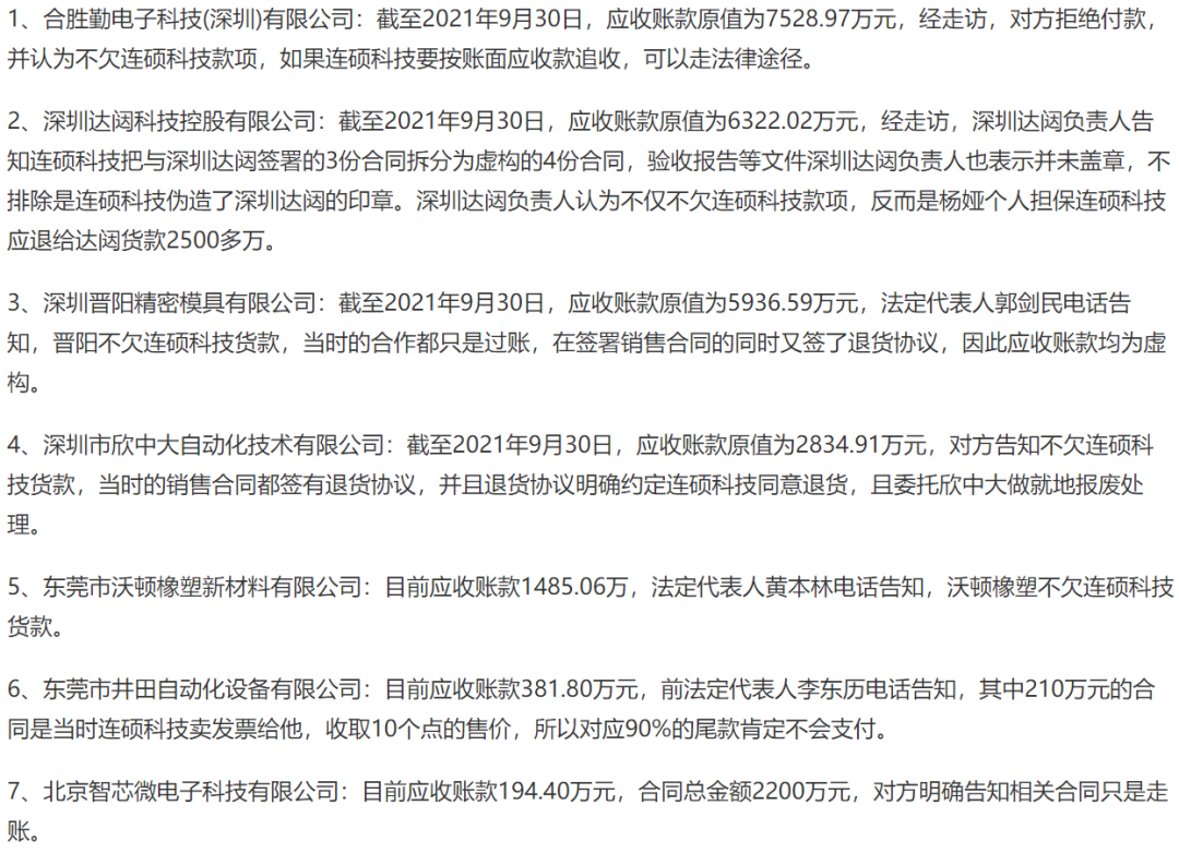 根据10月25日披露的连硕科技的《情况说明》,截至2021年9月30日,合胜勤电子科技(深圳)有限公司的应收账款原值为7528.97万元,东莞市沃顿橡塑新材料有限公司的应收账款为1485.06万元,但两家公司均拒绝付款,且认为不欠连硕科技款项。