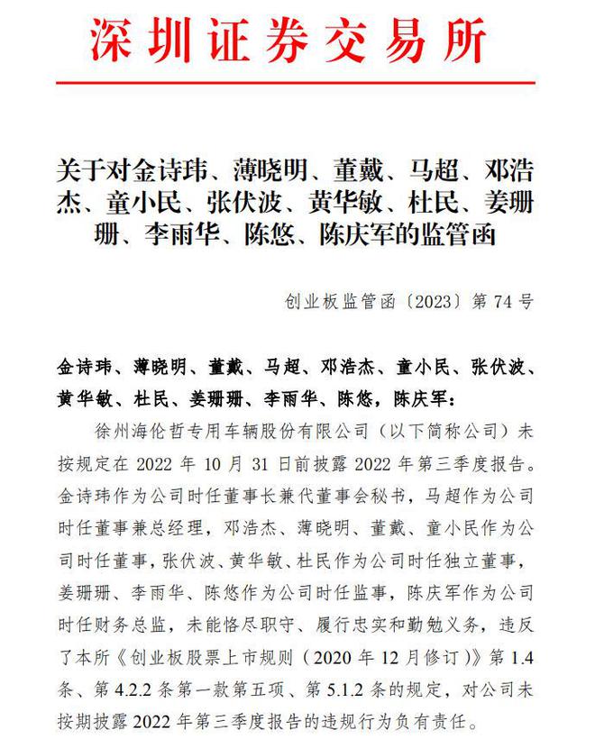 此外,深交所同日还发布了关于对金诗玮、薄晓明、董戴、马超、邓浩杰、童小民、张伏波、黄华敏、杜民、姜珊珊、李雨华、陈悠、陈庆军的监管函。该监管函提到,海伦哲未按规定在2022年10月31日前披露2022年第三季度报告。