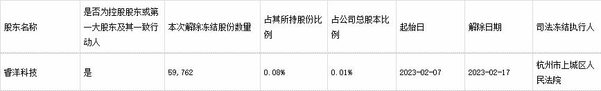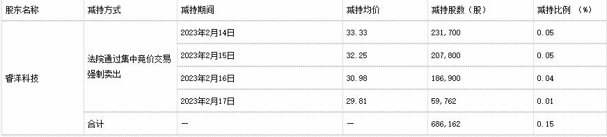 此外,睿洋科技于2023年2月16日知悉人民法院于2023年2月8日出具了《协助执行通知书》[(2021)浙0102执3075号],《协助执行通知书》要求东兴证券股份有限公司将睿洋科技持有的上市公司股票686162股,冻结状态调整为可售冻结,以市场价卖出。东兴证券于2023年2月17日强制卖出公司股份59762股,2023年2月14日-2023年2月17日累计强制卖出公司股份686162股,占公司总股本的0.15%。人民法院发出的《协助执行通知书》[(2021)浙0102执3075号]已执行发完毕。减持股份情况如下: