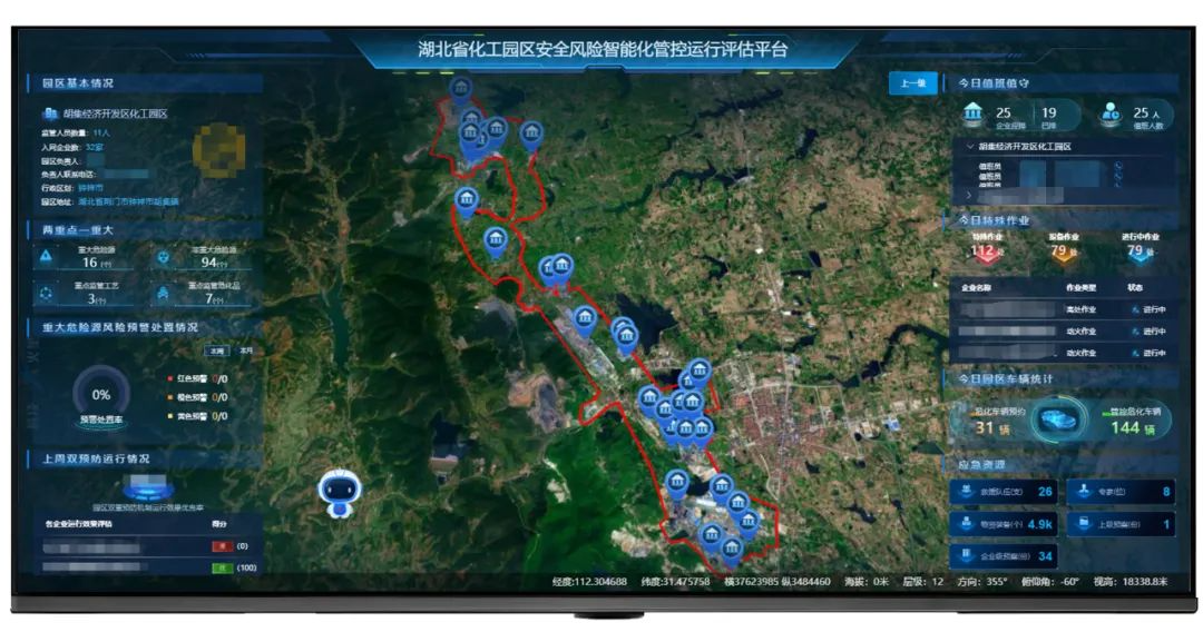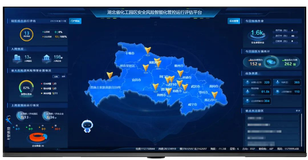 为确保全省各化工园区安全风险智能化管控平台的有效运行,湖北省应急厅牵头制定《湖北省化工园区安全风险智能化管控平台运行评估指南(试行)》、《湖北省化工园区安全风险智能化管控运行评估平台数据交换规范(试行)》标准,并建设湖北省化工园区安全风险智能化管控运行评估平台,构建6个方面、11大模块、16项核心评分项的量化评估指标,同时打造省级化工园区安全风险智能化管控平台运行评估体系。该平台已成为化工园区安全风险智能化管控平台运行评估全国创新试点。