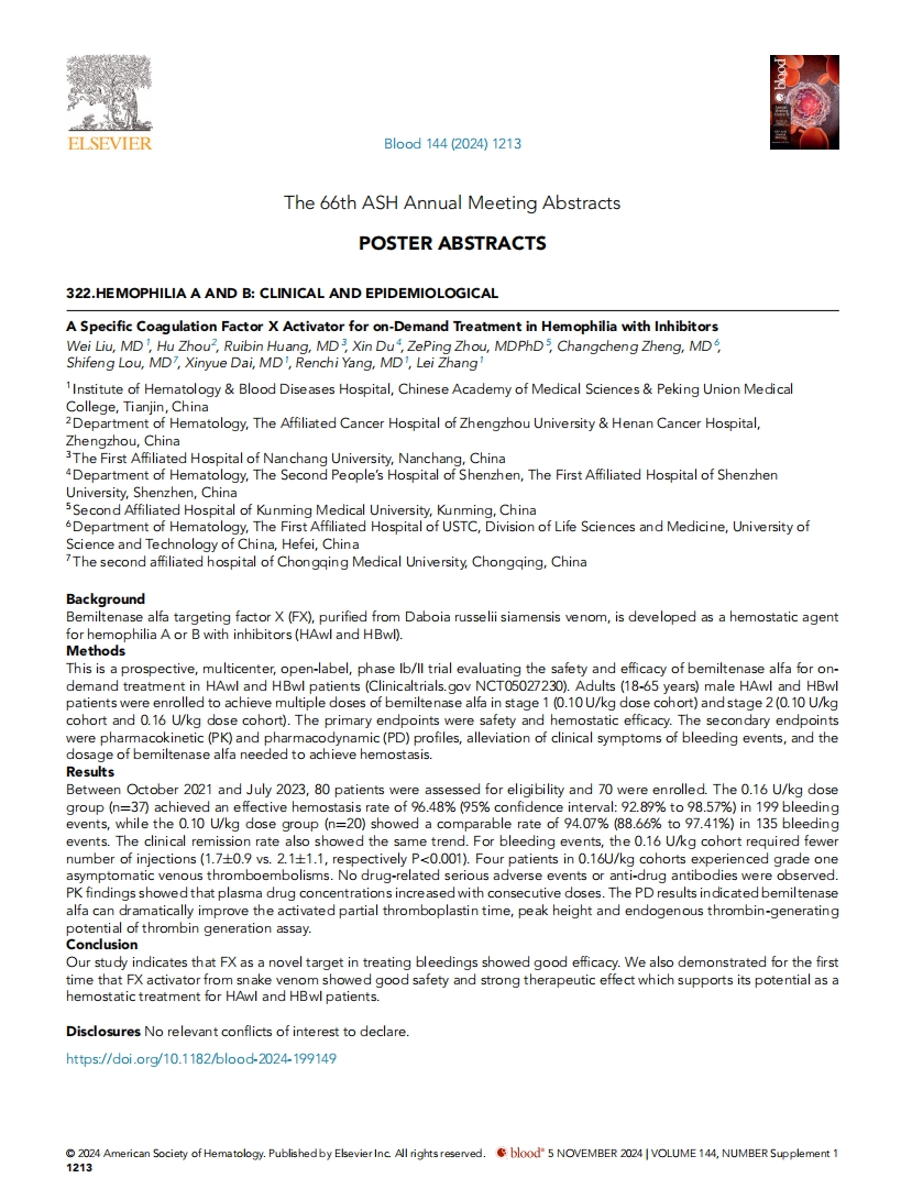 2023年11月,取得关于伴抑制物的血友病A或B患者出血按需治疗的Ib/Ⅱ期临床试验临床研究总结报告。