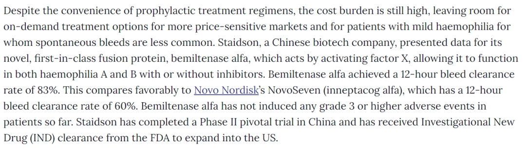 尽管预防性治疗方案很方便,但成本负担仍然很高,为价格更敏感的市场和自发性出血不太常见的轻度血友病患者留下了按需治疗选择的空间。来自中国的舒泰神生物制药公司介绍了其新型蛋白药物bemillenase alfa的数据,该蛋白通过激活因子X起作用,使其在有或没有抑制剂的情况下都能在血友病A和B中发挥作用。Bemiltenase alfa的12小时出血清除率为83%。这与诺和诺德的NovoSeven(inneptacog alfa)相比更优,后者的12小时出血清除率为60%。到目前为止,Bemiltenase alfa尚未在患者中引起任何3级或更高级别的不良事件。Staidson已在中国完成II期关键试验,并与美国食品药品监督管理局沟通新药临床试验(IND)批准,可以扩展到美国。