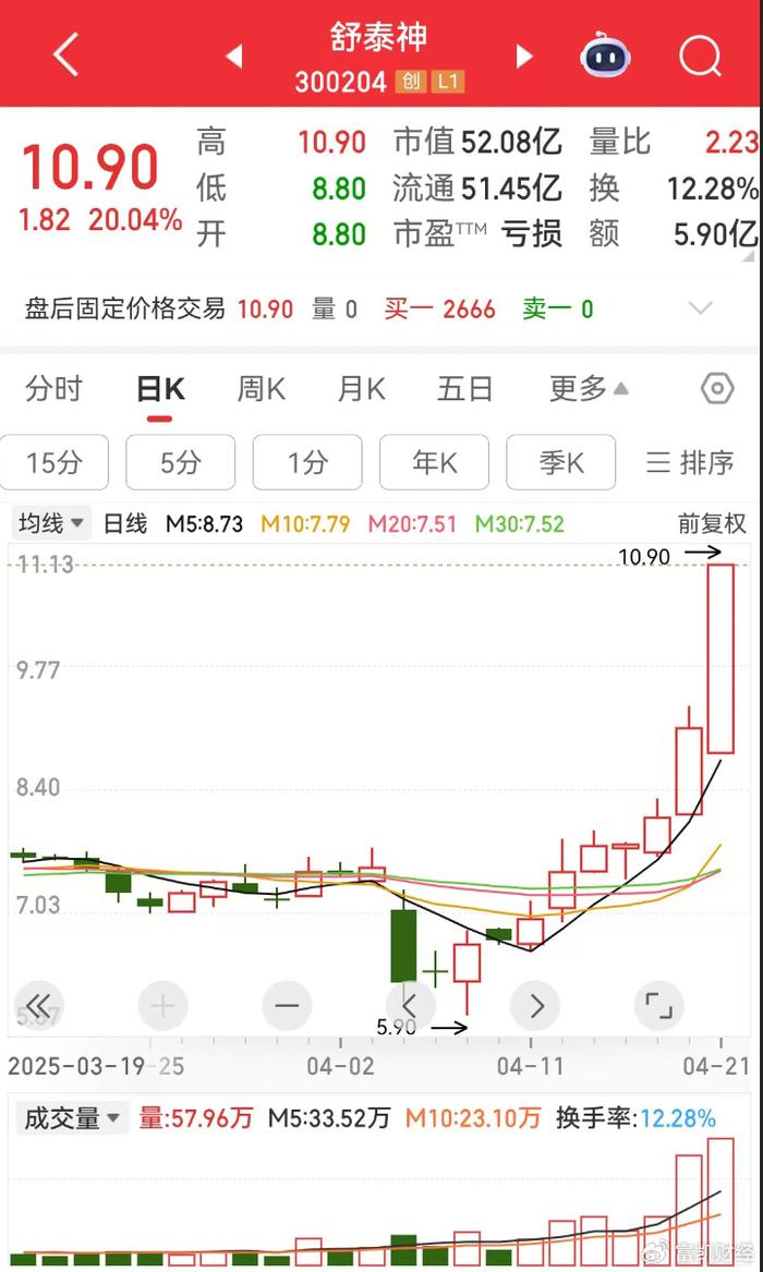 4月21日,舒泰神当日股价报收10.9元/股,涨幅高达20.04%,偏离值20.00%,换手率12.28%,成交额5.90亿。异常期间4月18日至4月21日,期间涨幅34.73%,累计偏离值32.68%,区间成交额10.32亿。