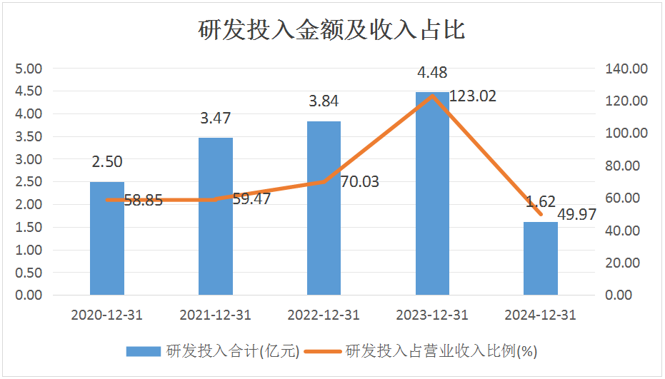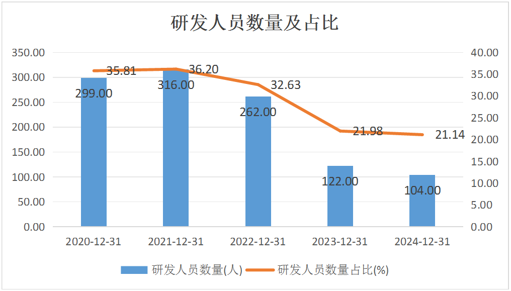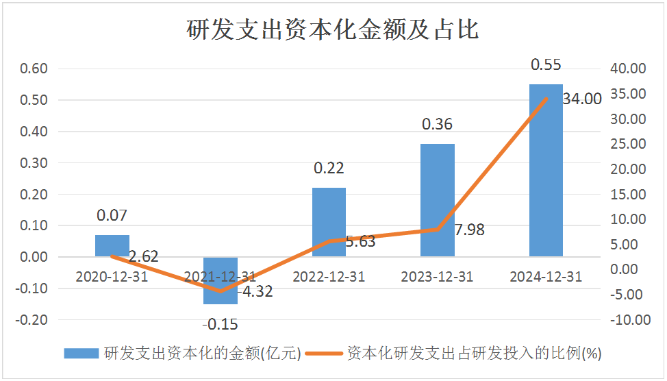同时,研发人员数量也从2020年的299人降至2024年的104人,研发人员在公司总人数中的占比也从2020年的35.81%降至2024年的21.14%;研发支出资本化金额呈现明显的上升态势,从2020年的0.07亿元上升至2024年的0.55亿元,资本化研发支出占研发投入的比例同样大幅度提升,从2020年的2.62%提升到2024年的34%;