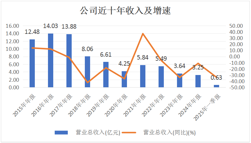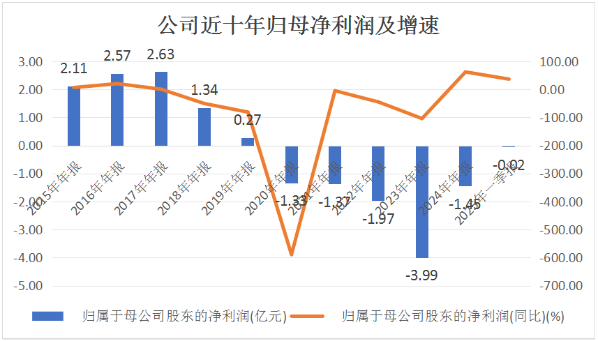 公司近十年收入、归属于母公司股东的净利润呈现明显的下滑态势,其中收入从2015年的12.48亿元下降到2024年的3.25亿元,累计下滑74%;归属于母公司股东的净利润从2015年的2.11亿元下降到2024年的-1.45亿元,2020年到2025年的归属于母公司股东的净利润更是连续五年亏损,分别为-1.33亿元、-1.37亿元、-1.97亿元、-3.99亿元、-1.45亿元,经营压力巨大。