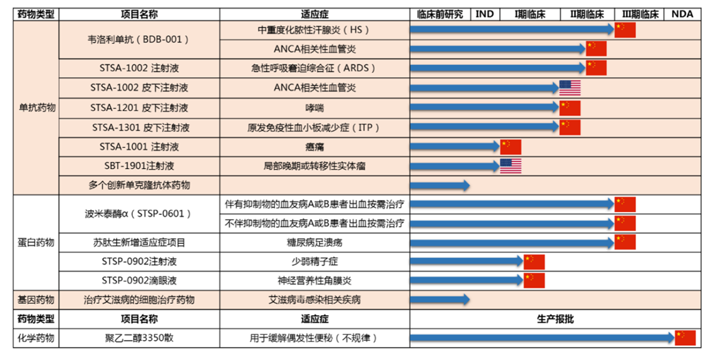 创新药管线核心产品主要是STSA-1002注射液,适应症为急性呼吸窘迫综合征(ARDS),以及波米泰酶α(STSP-0601),适应症为伴有或者不伴有抑制物的血友病A或B患者出血按需治疗。