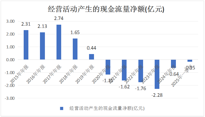 公司经营活动产生的现金流量净额近五年年年为负,从2020年到2024年分别为-1.15亿元、-1.62亿元、-1.76亿元、-2.28亿元、-0.64亿元,想指望公司自身经营产生的现金流来输血研发已经几无可能。