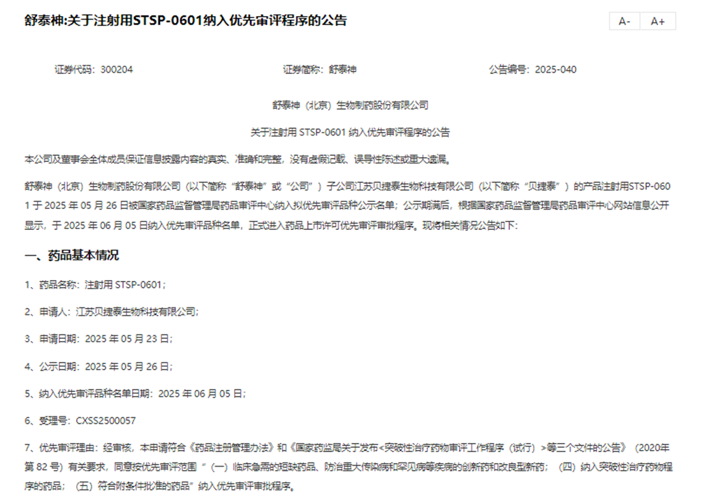 近日,创新药牛股舒泰神(300204.SZ)接连发布公告,创新药“注射用STSP-0601”收到了国家药品监督管理局下发的关于境内生产药品注册上市许可申请的《受理通知书》,同时该产品被国家药品监督管理局药品审评中心纳入拟优先审评品种公示名单。