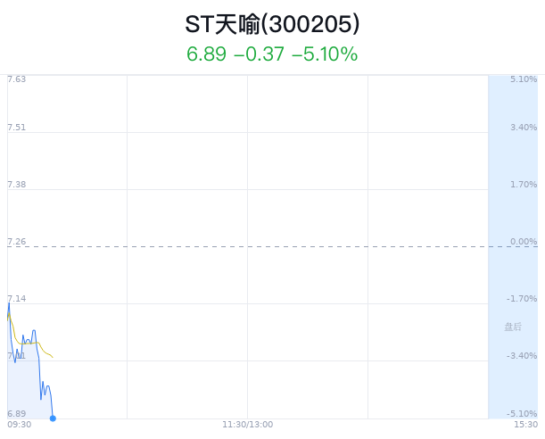 04月10日,ST天喻(300205)股价大幅下跌,截至09点52分,ST天喻下跌5.10%,报6.89元/股,成交2238万元,换手率0.75%,振幅4.27%。