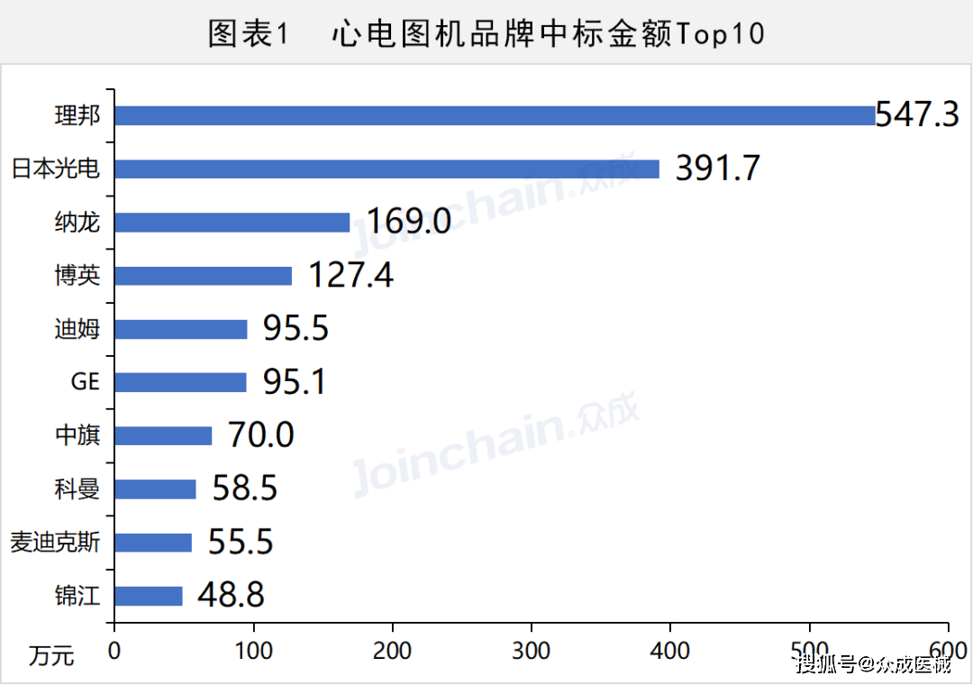 目前,国内市场已经基本实现国产心电图机对进口产品的替代,尤其在心电信息化领域,多数本土品牌产品逐步赶超进口品牌,并获得市场认可。根据8月份已披露的品牌与金额数据结果,理邦中标数量共计80件,中标总额合计547.3万元;日本光电与纳龙排名二、三,中标总额合计391.7万元和169.0万元。