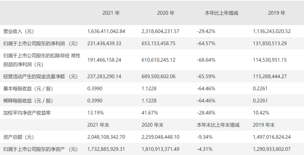 3月23日,理邦仪器发布了2021年的业绩报告,报告期内,该公司营业收入16.36亿元,同比下降29.42%;实现归属于上市公司股东的净利润为2.31亿元,同比下降64.57%;实现归属于上市公司股东的扣除非经常性损益的净利润为1.91亿元,同比下降68.64%;基本每股收益0.3990元。