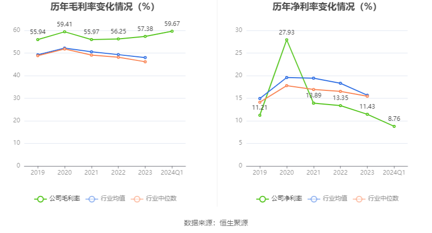 2024年第一季度,公司毛利率为59.67%,同比上升1.74个百分点;净利率为8.76%,较上年同期下降13.26个百分点。