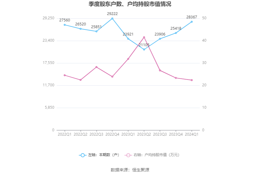 筹码集中度方面,截至2024年一季度末,公司股东总户数为2.84万户,较上年末增长了2949户,增幅11.60%;户均持股市值由上年末的23.37万元下降至22.39万元,降幅为4.19%。