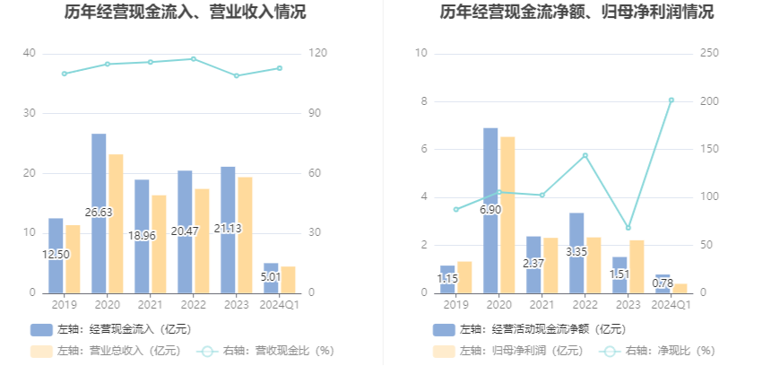 2024年第一季度,公司营业收入现金比为112.82%,净现比为201.78%。
