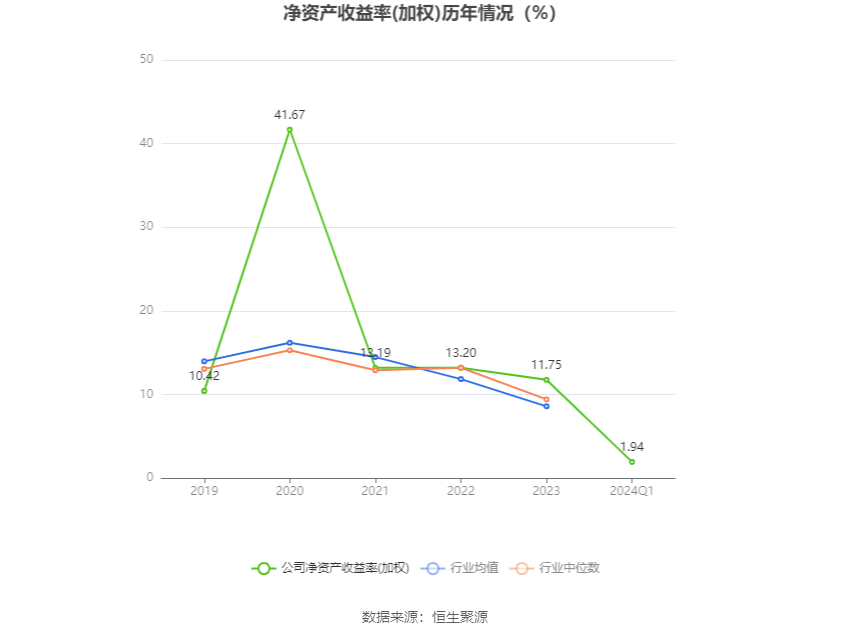 数据显示,2024年第一季度公司加权平均净资产收益率为1.94%,较上年同期下降5.36个百分点;公司2024年第一季度投入资本回报率为1.85%,较上年同期下降5.34个百分点。