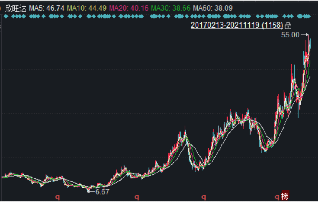 从二级市场走势来看,欣旺达近几年的股价走势非常喜人。自2018年10月16日跌至6.67元/股低点后,公司股价便开始节节上升,至2021年11月10日,涨至55元/股的高点,三年涨幅超过700%。