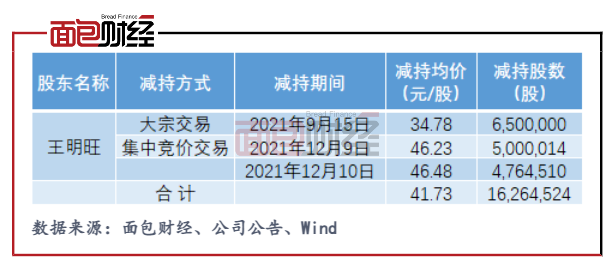 今年9月15日,王明旺还通过大宗交易方式减持公司股份650万股,减持均价为34.78元/股。加上12月份集中竞价减持部分,第四季度以来王明旺合计减持公司股份1626.45万股,占其减持前所持公司股份比例为4%。按照相应减持均价计算,王明旺合计套现约6.79亿元。