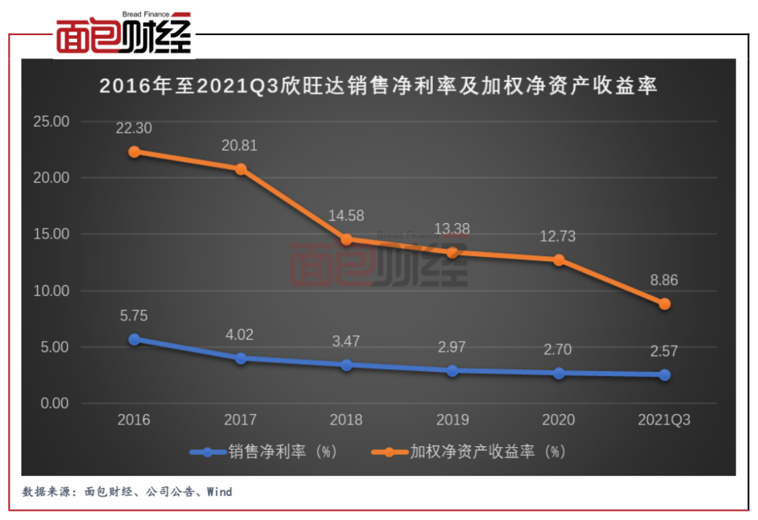 在欣旺达不断上涨的股价背后,是公司连续下降的盈利能力。近5年多以来,公司销售毛利率从2016年的5.75%下滑至2020年的2.7%,2021年前三季度进一步下滑至2.57%;加权净资产收益率由2016年的22.3%下滑至2020年的12.73%。