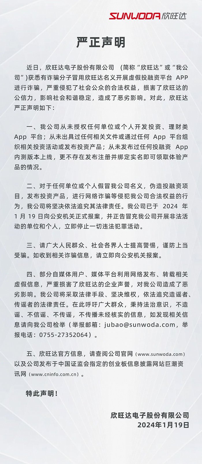 1月19日,欣旺达发布声明称,有诈骗分子冒用欣旺达名义开展虚假投融资平台APP诈骗。公司从未授权任何单位或个人开发投资、理财类App;从未出具过任何相关文件或通过任何App平台组织相关投资活动或发布投资产品。对于任何单位或个人假冒公司名义,伪造投融资项目,发布投资产品,进行网络诈骗等侵犯公司合法权益的行为,公司将坚决依法追究其法律责任。公司已于1月19日向公安机关正式报案,并正告冒充公司开展非法活动的单位和个人,立即停止一切违法犯罪活动。