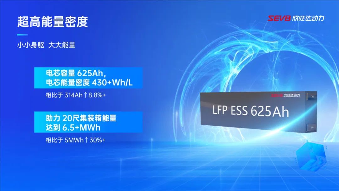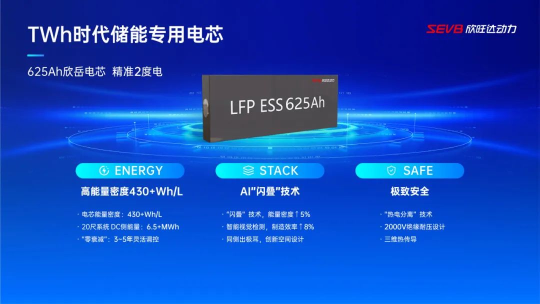 “欣岳”电芯容量为625Ah,能量密度达430+Wh/L,比314Ah电芯提升8.8%+。此外单电芯精准两度电,助力20尺集装箱能量达6.5+MWh,比5MWh提升30%+,对于储能电站来说,AC侧实现6MWh以上的能量,极大地降低了初期投资成本。