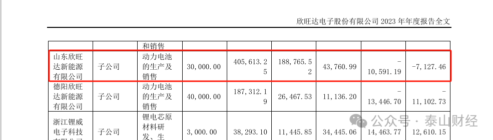 根据公司年报,截至2023年底,作为欣旺达在枣庄项目的主要实施主体,山东欣旺达总资产为40.56亿元,净资产为18.88亿元,2023年,山东欣旺达实现营业收入4.38元,实现净利润-7127.46万元。
