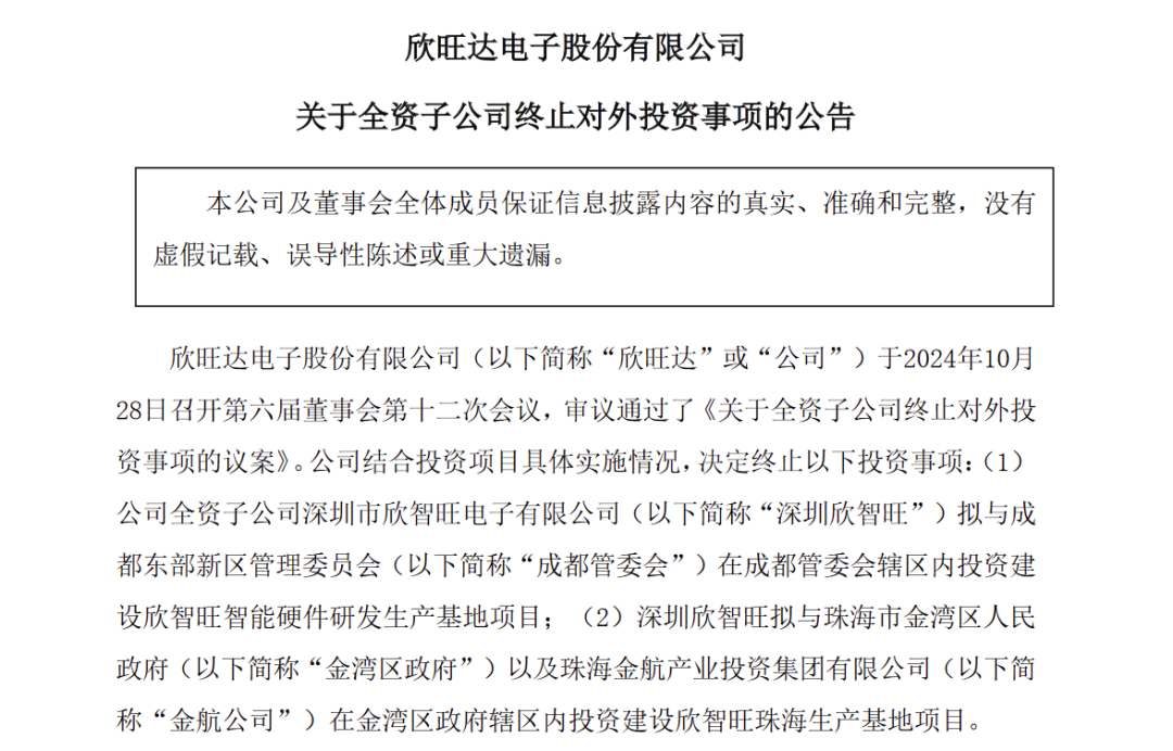 10月29日,欣旺达公告,公司董事会审议通过了《关于全资子公司终止对外投资事项的议案》。结合投资项目具体实施情况,欣旺达决定终止全资子公司深圳市欣智旺电子有限公司(以下简称“深圳欣智旺”)在成都和珠海的两个拟投资事项。
