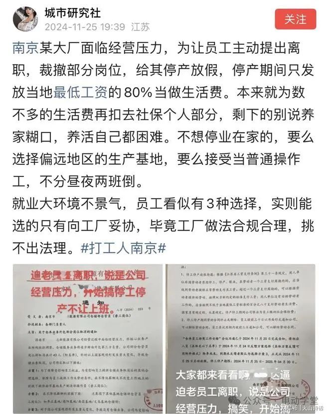 11月25日,有博主爆料称,南京某大厂面临经营压力,为让员工主动提出离职,裁撤部分岗位,给其停产放假,停产期间只发放当地最低工资的80%当做生活费。本来就为数不多的生活费再扣去社保个人部分,剩下的别说养家糊口,养活自己都困难。不想停业在家的,要么选择偏远地区的生产基地,要么接受当普通操作工,不分昼夜两班倒。