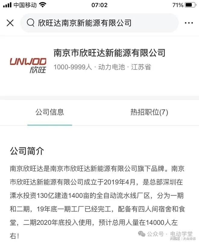 据了解,南京欣旺达是南京市欣旺达新能源有限公司旗下品牌。南京市欣旺达新能源有限公司成立于2019年4月,是总部深圳在溧水投资130亿建造1400亩的全自动流水线厂区,分为一期和二期。19年底一期工厂已经完工,配备有四人间宿舍和食堂,二期2020年底投入使用,预计总用人量在14000人左右。
