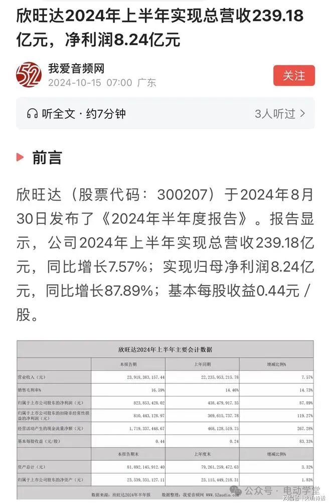 另据媒体最新报道,欣旺达(股票代码:300207)于2024年8月30日发布了《2024年半年度报告》。报告显示,公司2024年上半年实现总营收239.18亿元,同比增长7.57%;实现归母净利润8.24亿元,同比增长87.89%;基本每股收益0.44元/股。