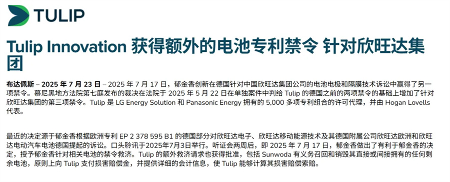 2025年7月23日,目前动力锂电池行业唯一的专利池Tulip(郁金香)在其官方网站发布了一则声明,显示已经对中国电池制造商欣旺达获得了额外的一项禁令。该专利池是由韩国LG和日本松下联合成立的。