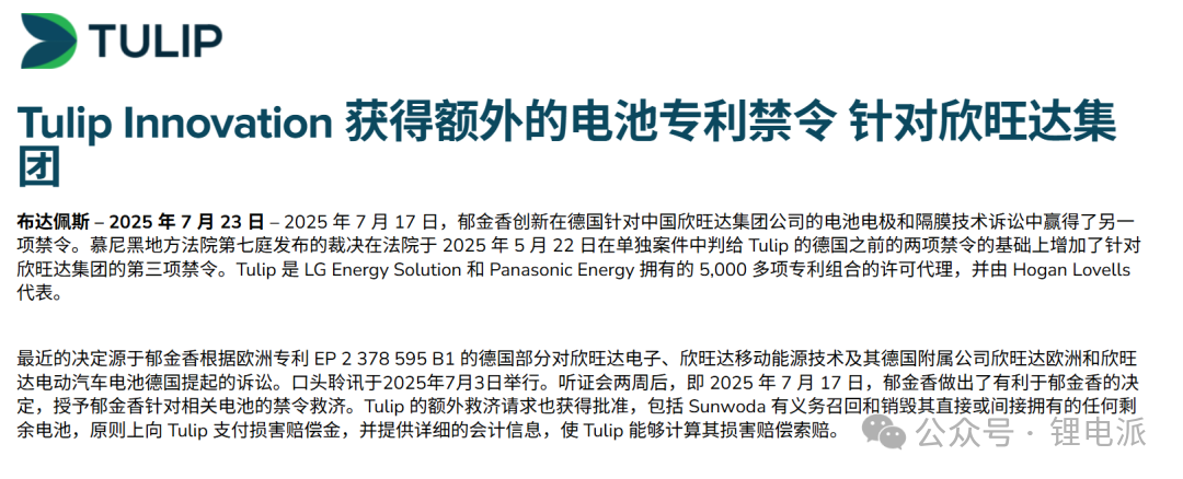 2025年7月23日,目前动力锂电池行业唯一的专利池Tulip(郁金香)在其官方网站发布了一则声明,显示已经对中国电池制造商欣旺达获得了额外的一项禁令。该专利池是由韩国LG和日本松下联合成立的。Tulip Innovation 官网宣布,韩国电池巨头LG能源解决方案(LG Energy Solution)在德国慕尼黑地方法院对中国动力电池制造商欣旺达(Sunwoda)提起的三起关键专利技术侵权诉讼中全部获胜。最新一场胜诉涉及LG能源持有的“电极组装结构”专利,法院判定欣旺达的方形锂电池产品构成侵权,随即下达德国销售禁令,并要求其销毁库存、提交会计记录、支付赔偿金。