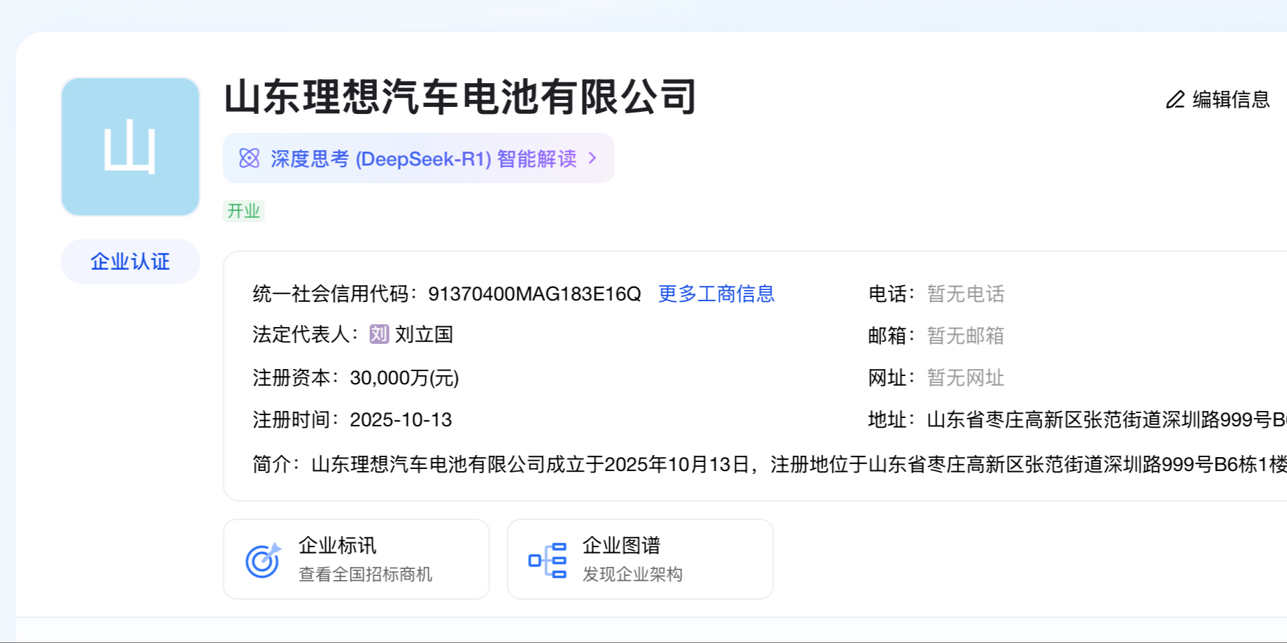 10月13日讯,山东理想汽车电池有限公司成立,法定代表人为刘立国,注册资本为3亿元,经营范围包含:电池制造;电池销售;新兴能源技术研发;集中式快速充电站;新材料技术研发;软件开发等。此前,理想宣布,理想汽车与电池厂商欣旺达将以50:50的出资比例成立合资公司,合资公司注册名为山东理想汽车电池有限公司,将用于生产理想汽车自研的动力电池产品。