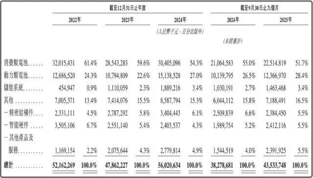 业务层面,消费类电池仍然是欣旺达收入的支柱,但呈逐年下降态势,由2022年的61.4%下滑至2024年的54.3%,去年前三季度进一步下降至51.7%。