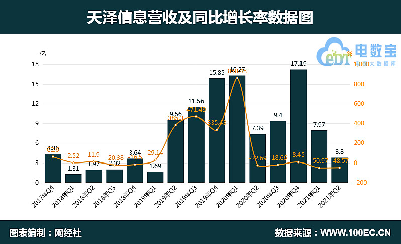 8月28日,天泽信息发布2021年半年度财报显示,公司上半年营收达11.77亿元,同比下降50.27%;净亏损达9.49亿元,同比下降1285.48%。