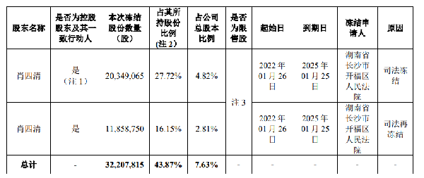截至2022年1月26日,肖四清持股比例为10.03%,累计被冻结股份约3221万股,占其所持股份比例的76.1%,占公司总股本的7.63%;中住集团持股比例为7.37%,累计被冻结股份约3110万股,占其所持股份比例的100%,占公司总股本的7.37%。