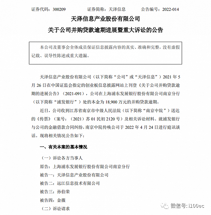 4月25日消息,日前,天泽信息收到法院传票,系在浦发银行南京分行的1.89亿元并购贷款逾期。