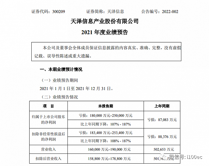 日前,天泽信息发布2021年业绩预告。报告显示,预计2021年净利亏损18亿元-25亿元,同比下降107-187%;扣除非经常性损益后的净利润亏损18.34亿元-25.34亿元,同比下降108%-187%。预计营业收入16亿元-19亿元,上年同期50.27亿元;预计扣除后营业收入15.9亿元-17.9亿元,上年同期50.18亿元。