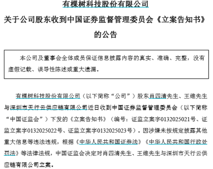 根据公告,有棵树股东肖四清、王维与深圳市天行云供应链有限公司近日收到中国证监会下发的《立案告知书》。因涉嫌未按规定披露其他重大信息等违法违规,根据相关法律法规,中国证监会决定对肖四清、王维与深圳市天行云供应链有限公司立案。